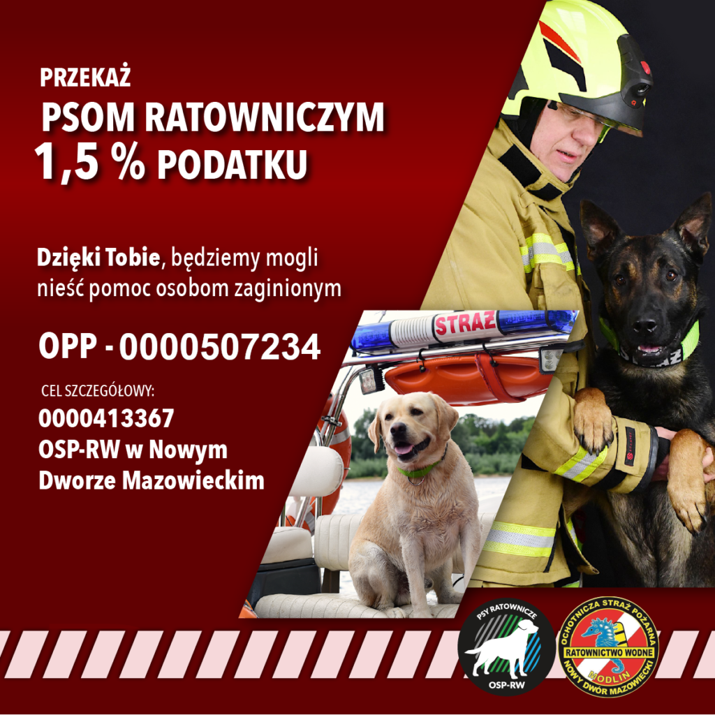 Nasze stowarzyszenie działające pod nazwą Ochotnicza Straż Pożarna Ratownictwo Wodne z siedzibą w Nowym Dworze Mazowieckim, nie posiada jeszcze statusu Organizacji Pożytku Publicznego, jednakże możesz nam przekazać swój 1% podatku należnego za pośrednictwem Fundacji Edukacji i Techniki Ratownictwa z siedzibą w Warszawie. W tym celu jeżeli rozliczasz się na podstawie: