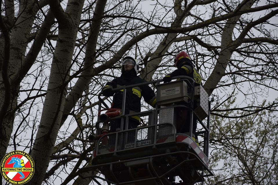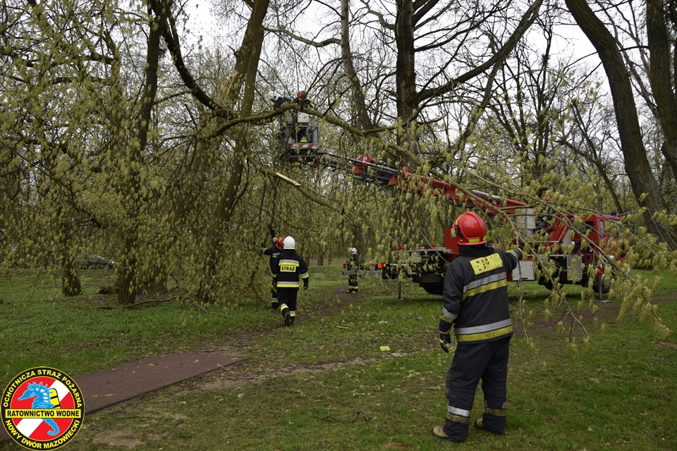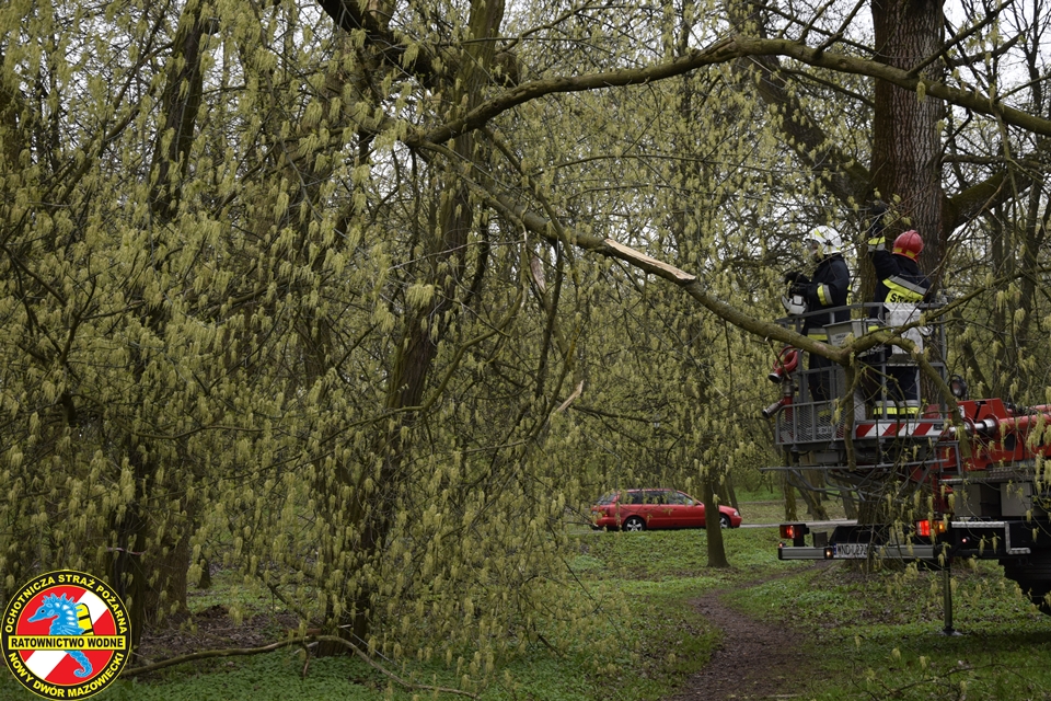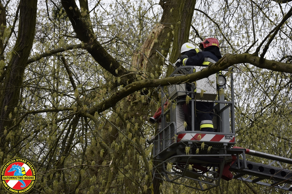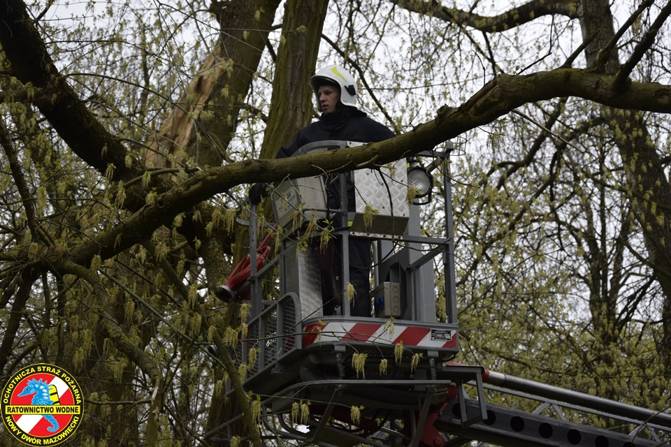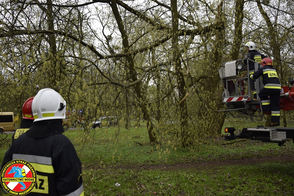 Na miejscu obecny był zastęp z JRG Nowy Dwór Mazowiecki oraz podnośnik hydrauliczny oraz patrol Straży Miejskiej. Nasz ratownik z ratownikiem z PSP w koszu podnośnika na wysokości dokonali wycinki zagrażających elementów drzewa.