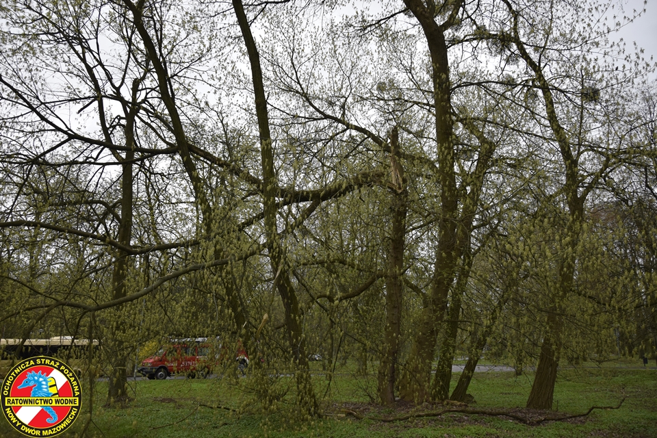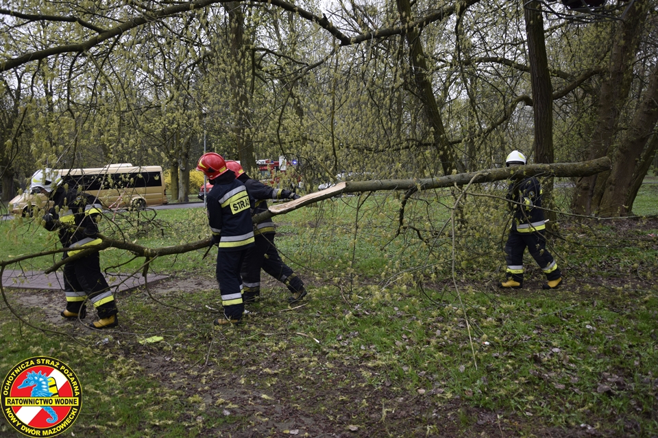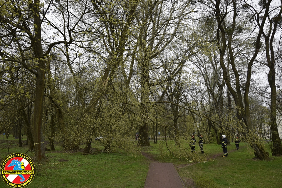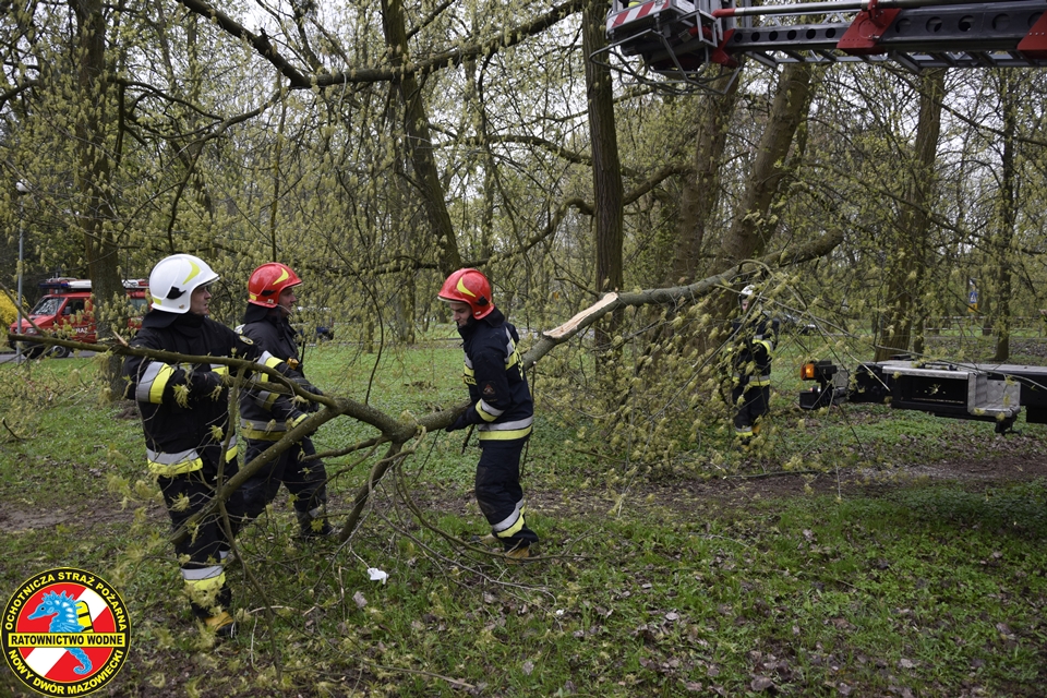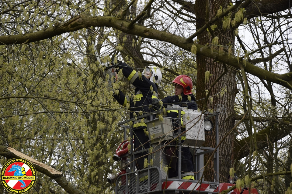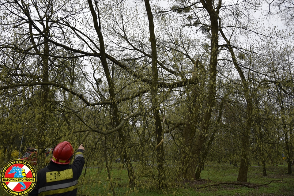 Na miejscu obecny był zastęp z JRG Nowy Dwór Mazowiecki oraz podnośnik hydrauliczny oraz patrol Straży Miejskiej. Nasz ratownik z ratownikiem z PSP w koszu podnośnika na wysokości dokonali wycinki zagrażających elementów drzewa.